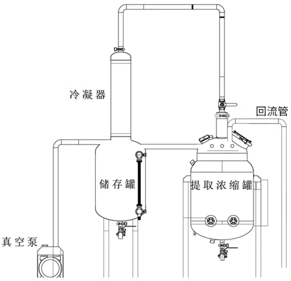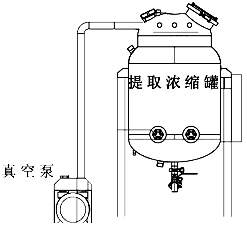 藥材提取后放出提取液,倒出藥渣,濃縮罐抽真空后經回流管回到